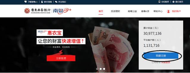 登录我行官网(http://www.gdnybank.com)在官网页面点击注册,并录入个人信息,注意输入手机号码必须为需要绑定的银行卡的预留手机号码,完成注册。(操作见图1、图2)