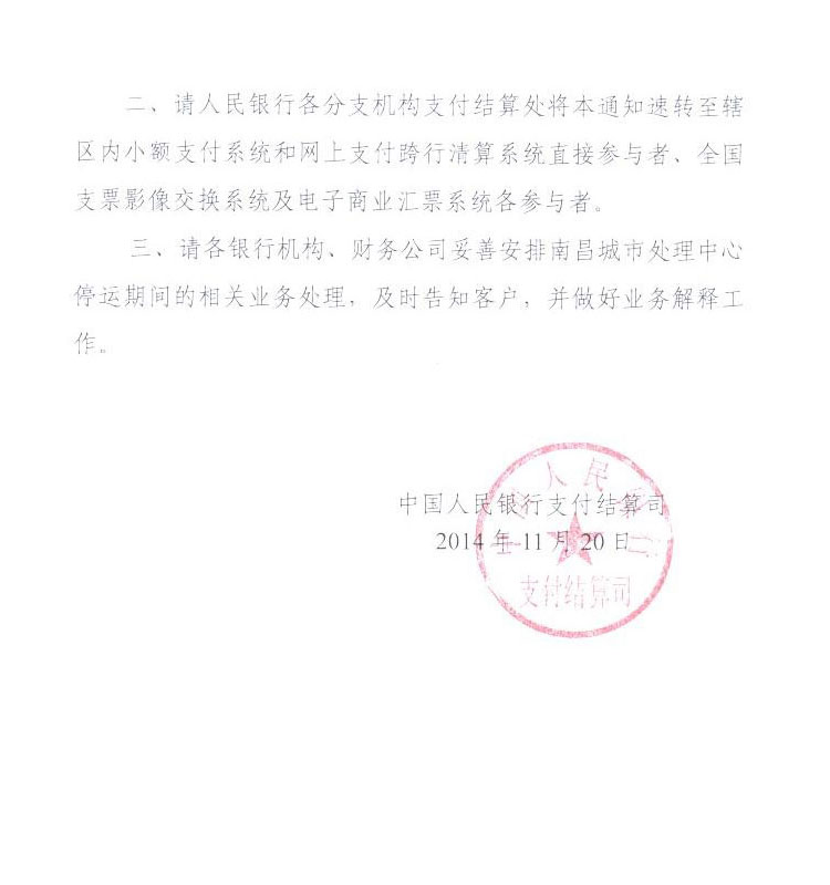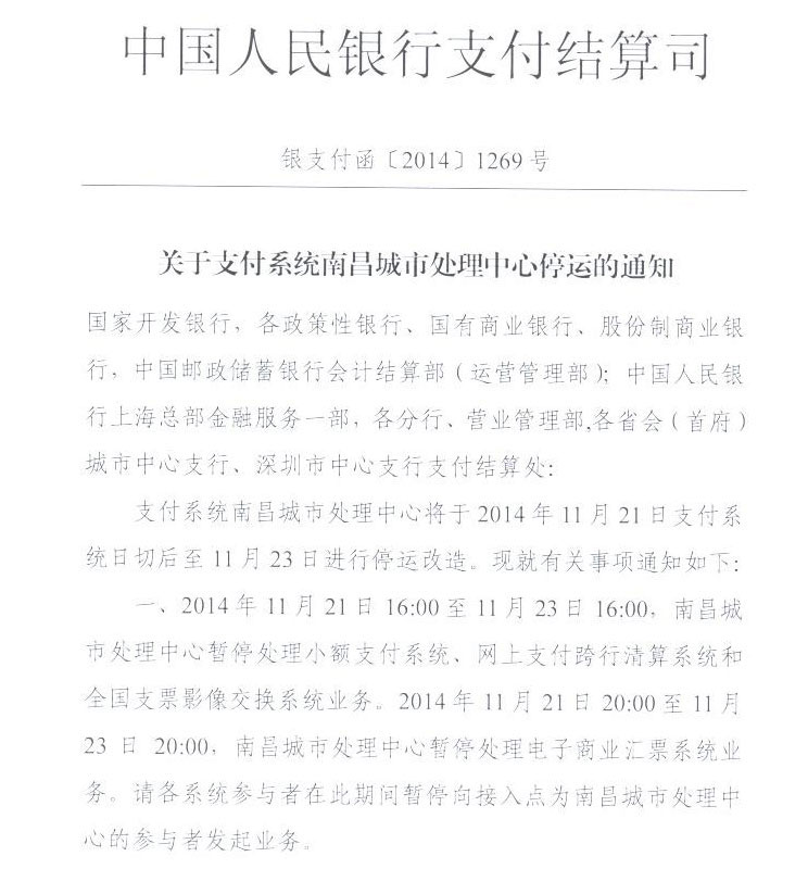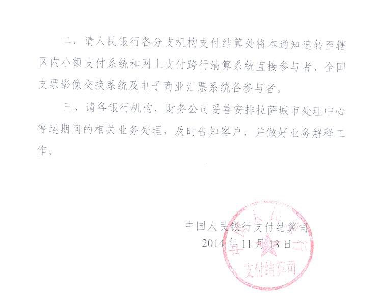 关于支付系统南昌、拉萨城市处理中心停运的通知