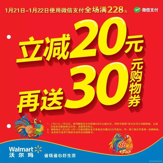 1月21日至2月11日,在沃尔玛全国门店,使用广东南粤银行卡微信支付消费满228元即可立减20元优惠,同时获得一张30元购物券(1月21日限量20万名额,1月22日限量10万名额,详情见门店海报)。 ps: 30元购物券于1月23日至2月11日在沃尔玛使用广东南粤银行卡微信支付消费满250元可抵扣现金使用。 |