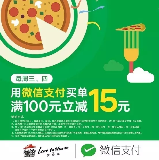 1月11日至2月2日(每周三、周四),在必胜客全国门店,使用广东南粤银行卡微信支付消费满100元即可立减15元优惠。(名额有限先到先得,活动详情以门店海报为准) |